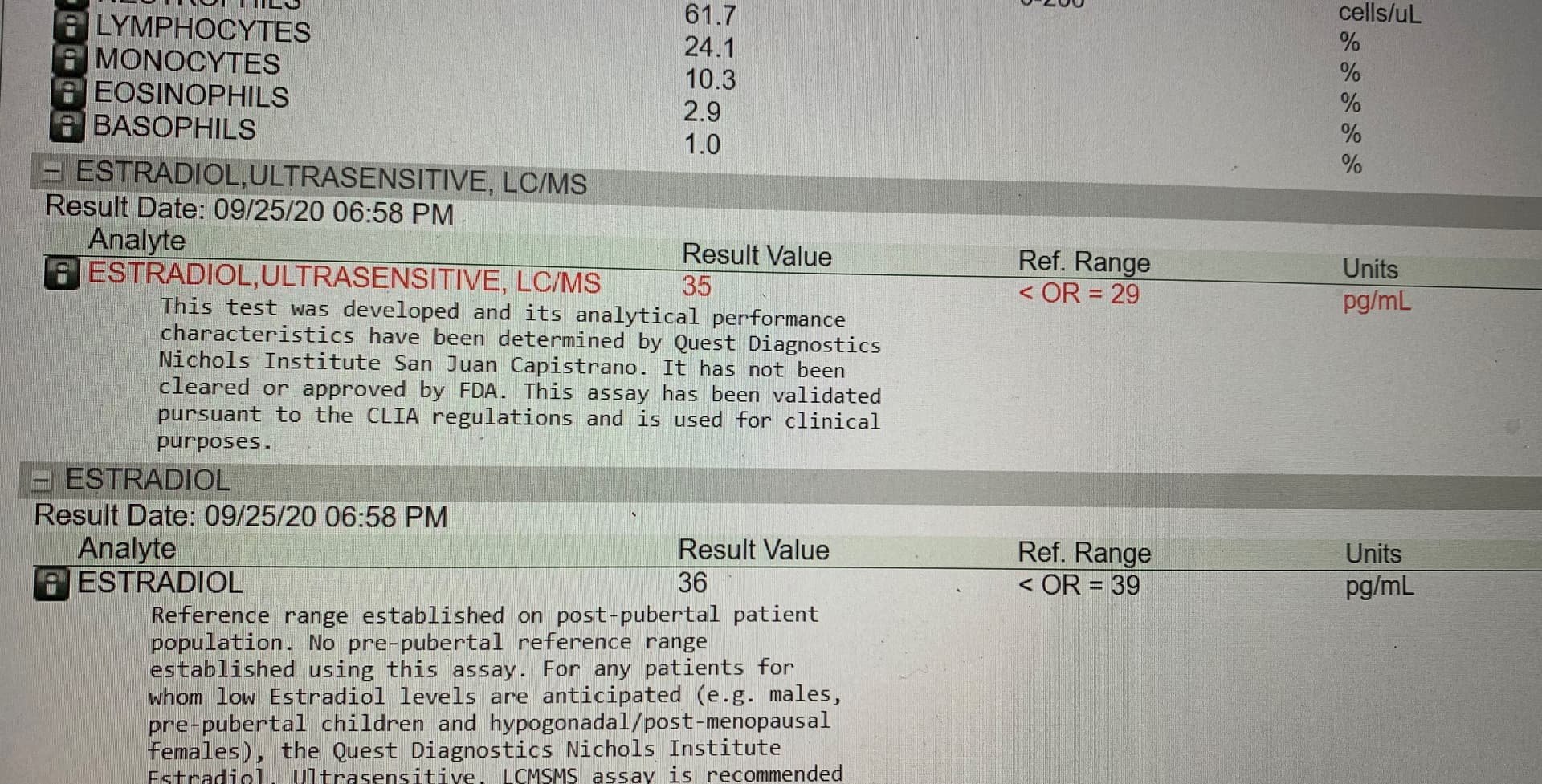 The LC/MS/MS method will pick up lower E2 levels and would be indicated in menopausal women and some men if very low E2 levels are suspected and it is desired to know exactly how low, children and the previously mentioned women on anti-estrogen therapy. It will not be influenced by elevated CRP levels or other steroid metabolites.