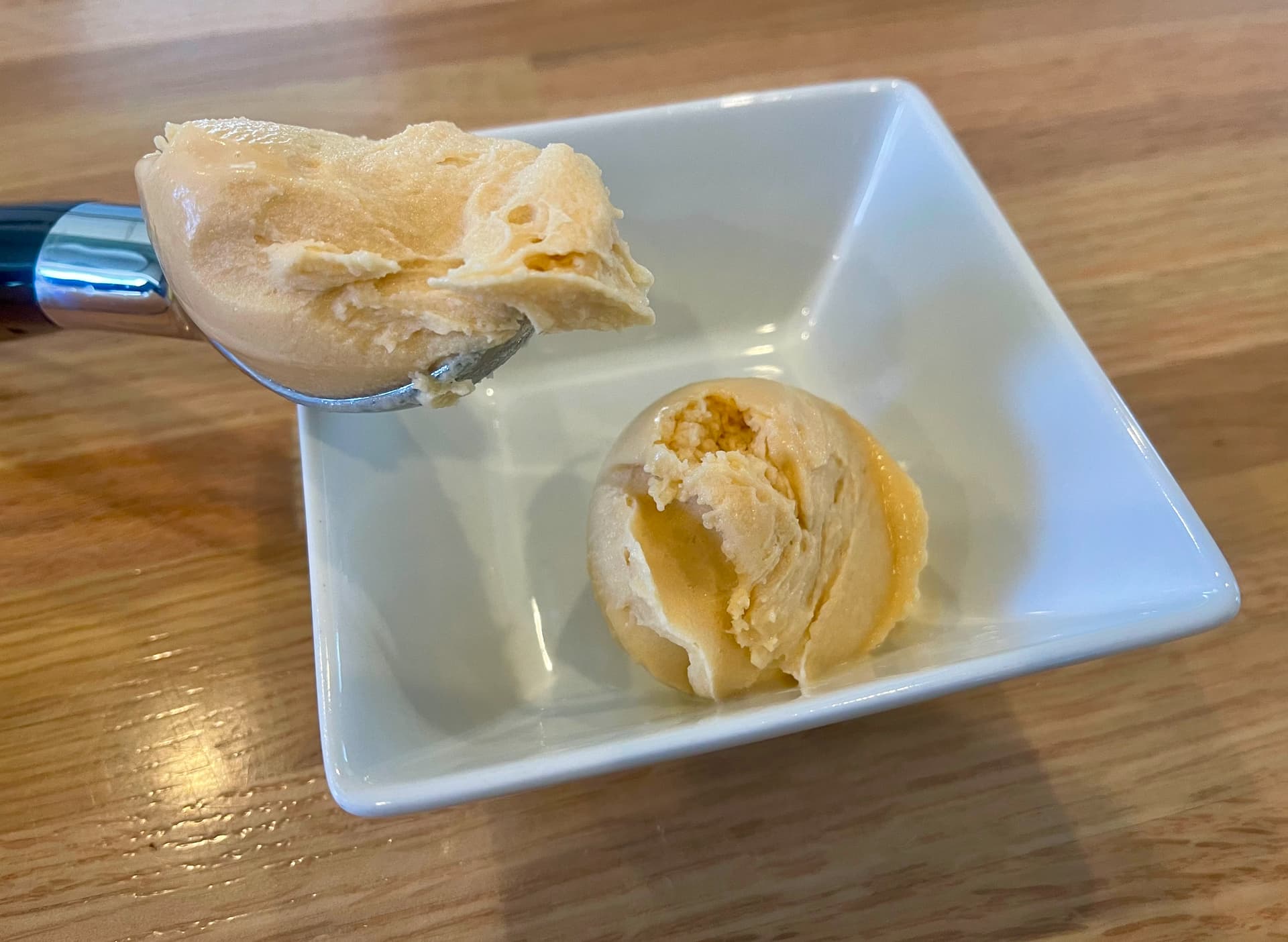 This is the peanut butter recipe. I had a few bites, then froze it for a few more hours until was more like traditional ice cream. Much depends on your freezer setting, too.
